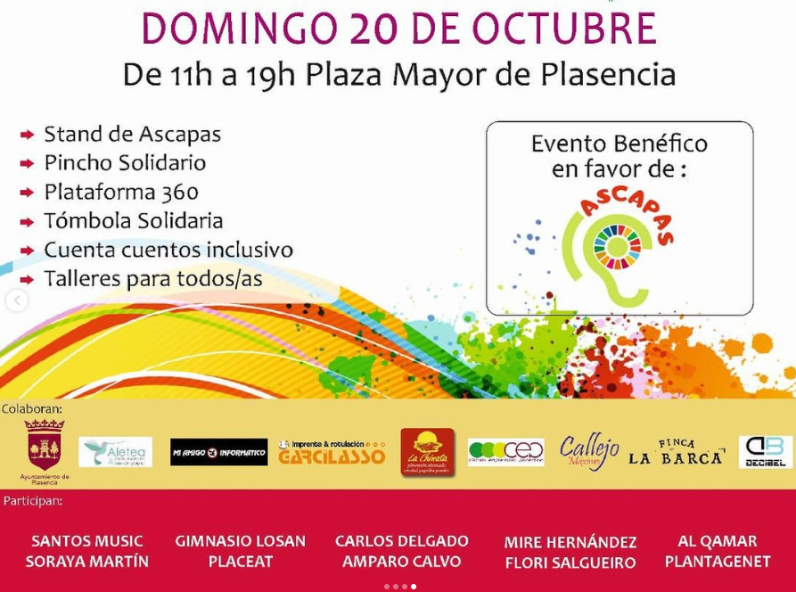 Tenemos el placer de anunciar que el próximo domingo 20 de octubre se realizará una nueva edición del Plasencia Baila, este año a favor de ASCAPAS✨✨. Estaremos todo el día bailando diferentes estilos musicales.