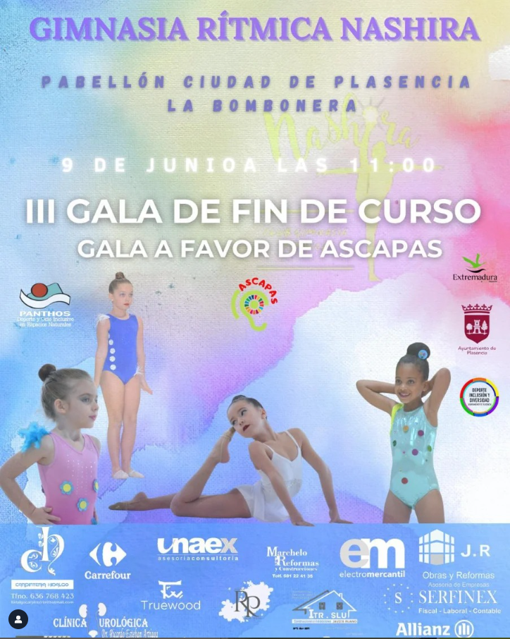 📆 El 9 de junio, se realizará la III GALA DE FIN DE CURSO DEL CLUB DE GIMNASIA RÍTMICA NASHIRA. Este evento tendrá lugar en el pabellon de la ciudad deportiva, la Bombonera, en Plasencia, a favor de Ascapas. 💚🎉