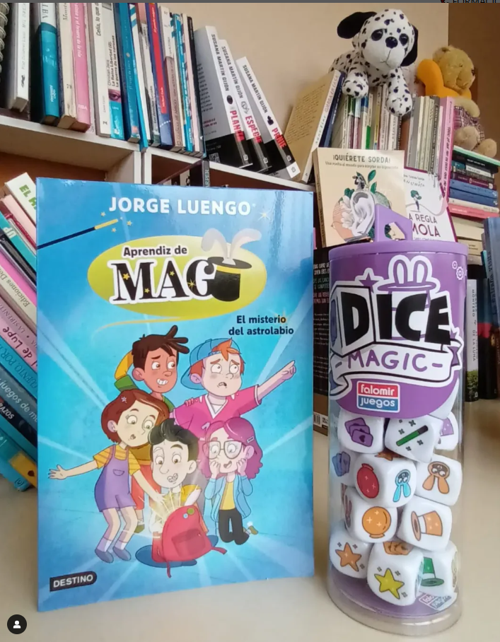 Libro "Aprendiz de Mago" de Jorge Luengo y un juego de dados "Dice Magic" sobre una mesa, con estantería de libros al fondo y peluches encima.